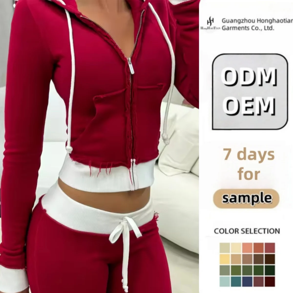 ODM OEM Custom Women's Hooded Sweatshirt Set Custom Blank French Terry Cotton pink Zip up Cropped Hoodie and Joggers Set