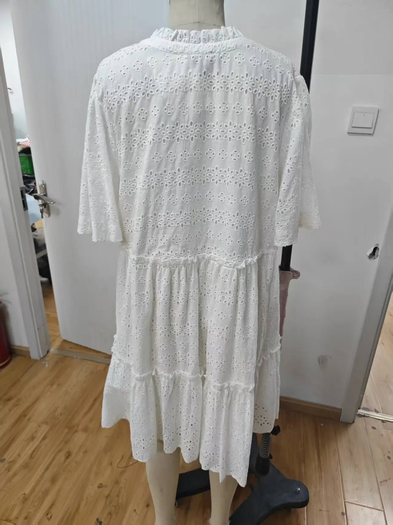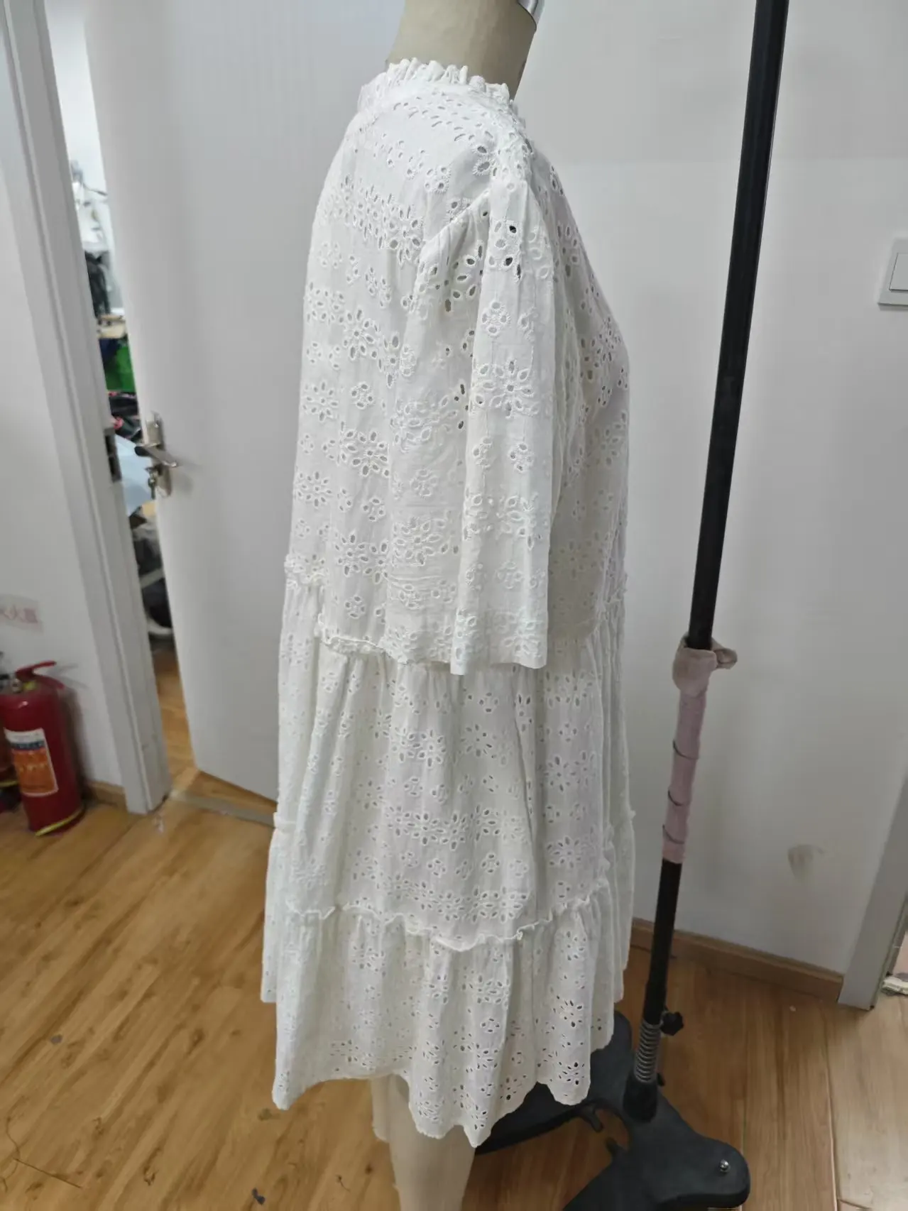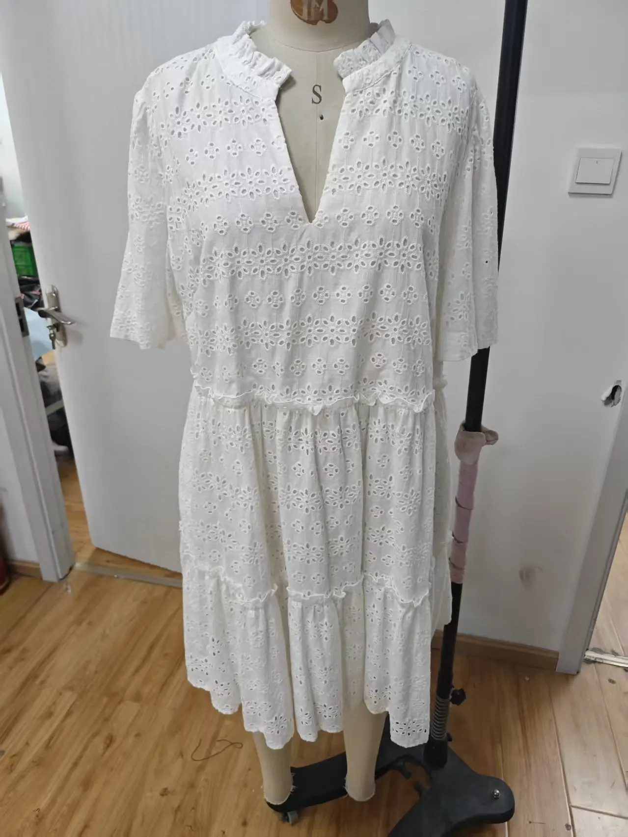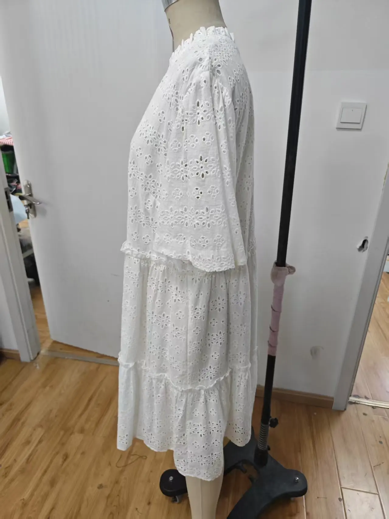 2026 Summer Women's Elegant V-neck Lace Dress with Flower Hollow Design Loose Casual Solid Color