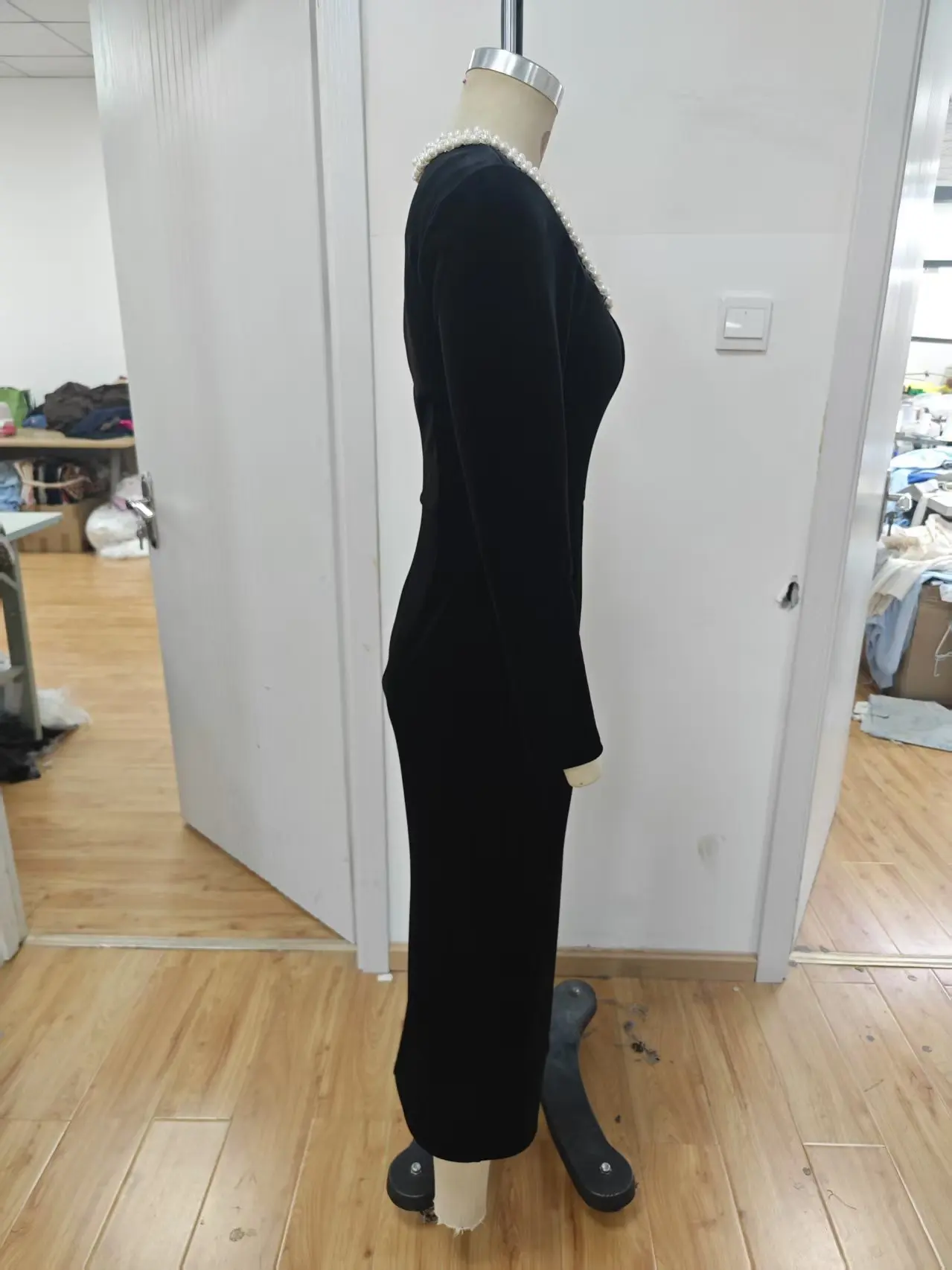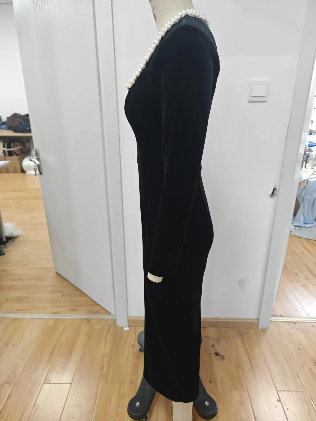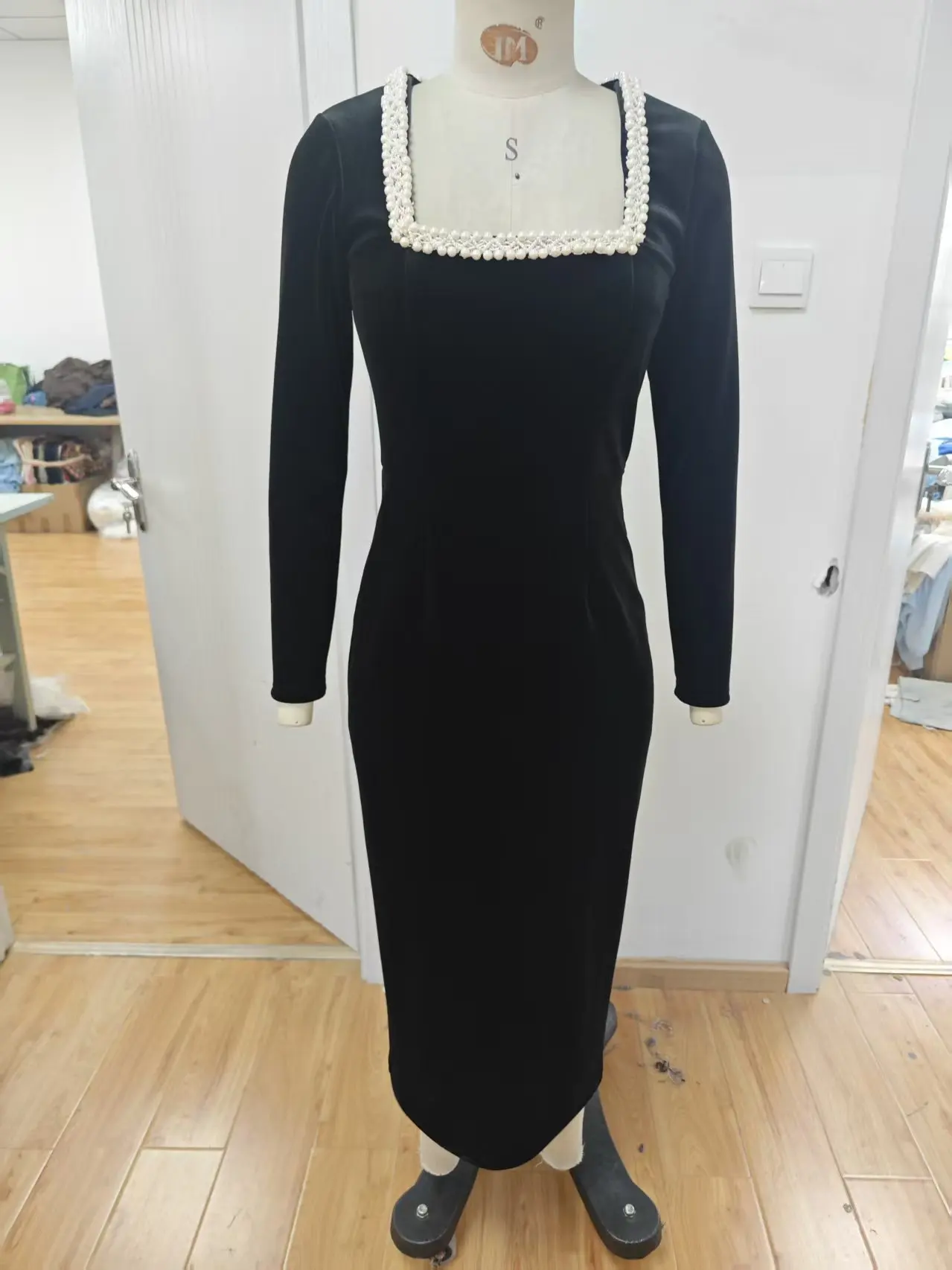 Retro Spring and Autumn Maxi Dress with Pearl Details, Breathable Weaving and Fine Spinning Fabric, Square Neck, Solid Color
