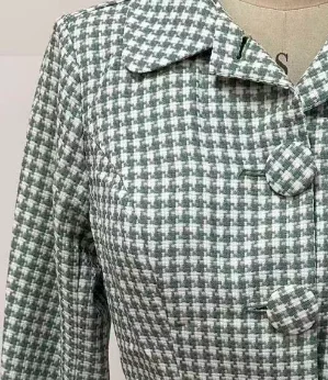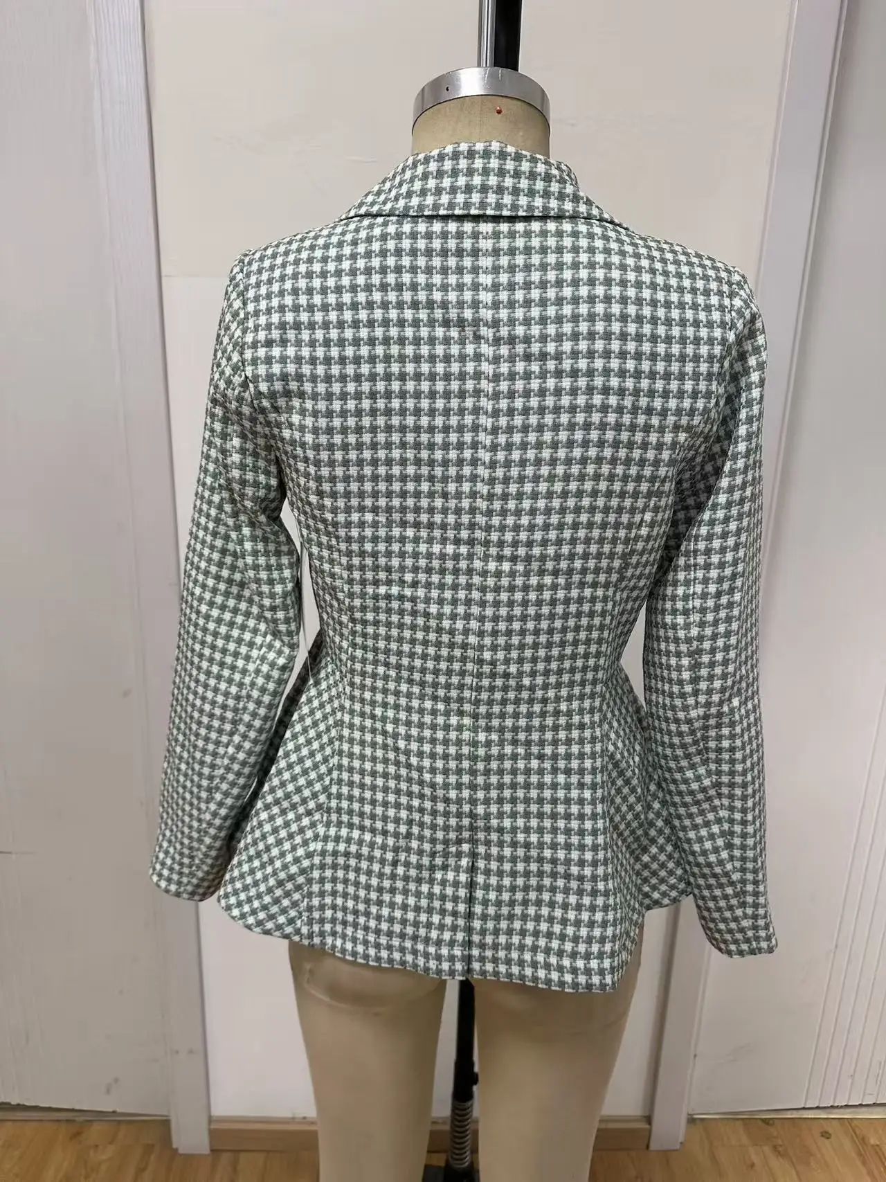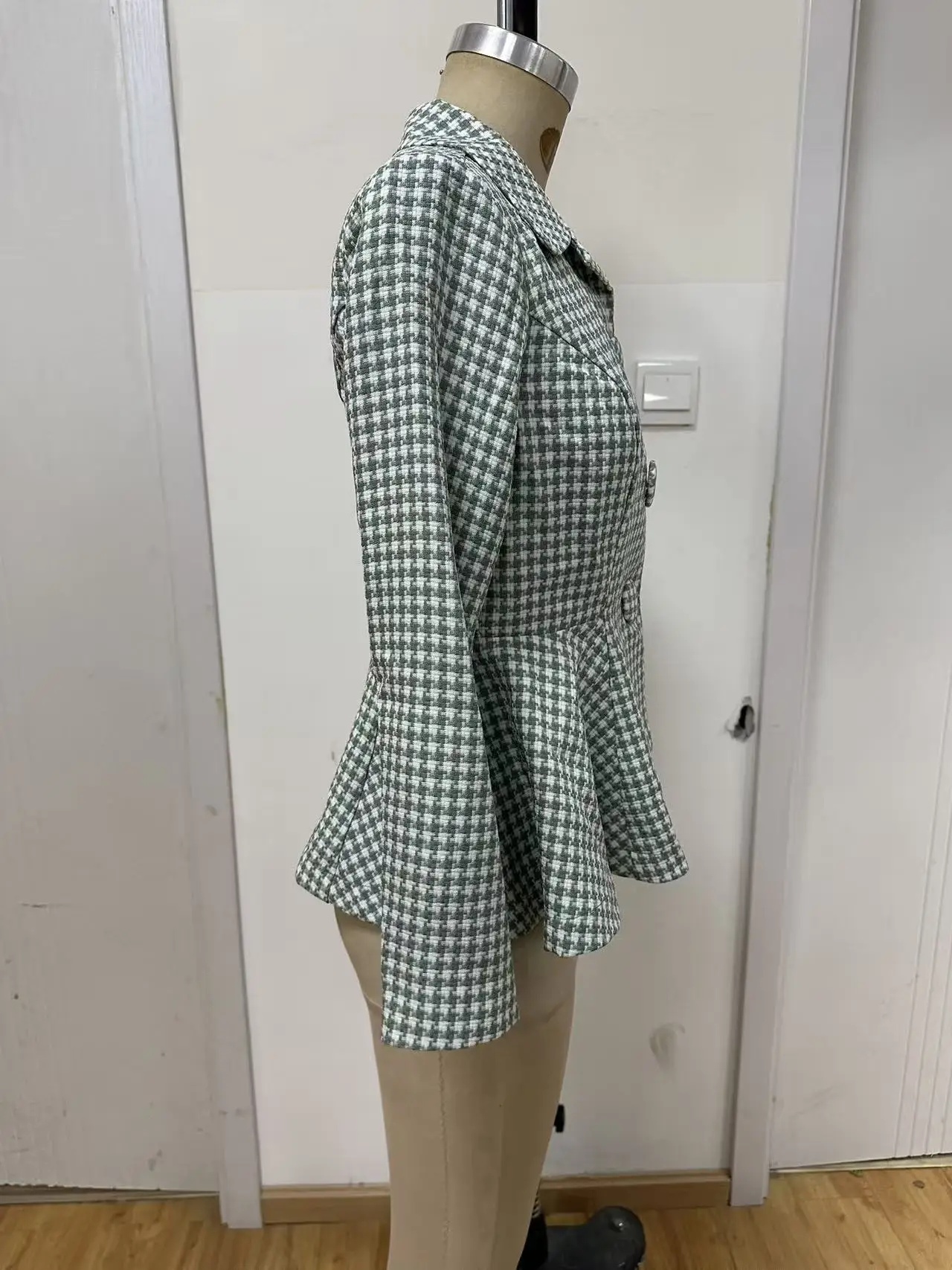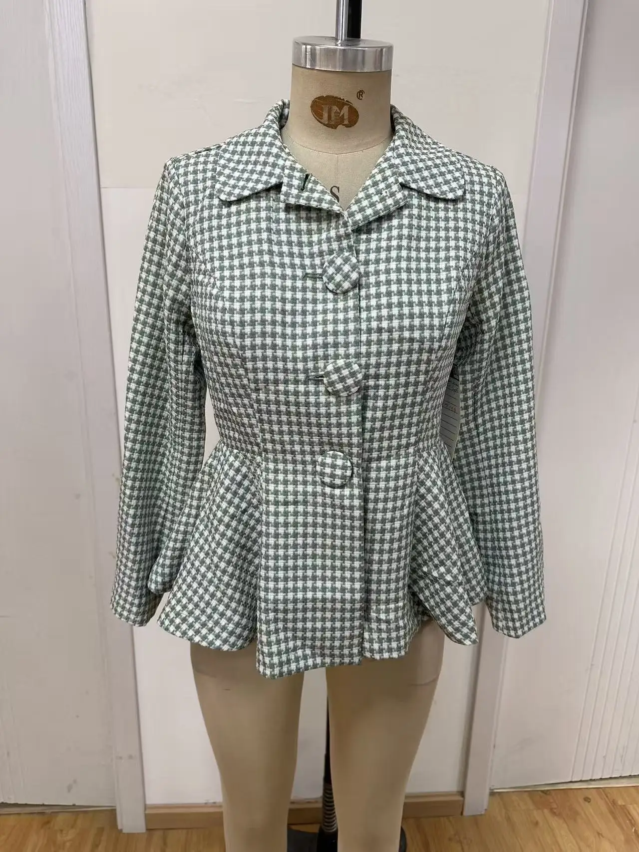 ZYHT 15545 Women's Blouses & Shirts Mint Green Tweed Blazer with Puff Sleeves & Peplum Fit Button-Detail Long Sleeve Jacket