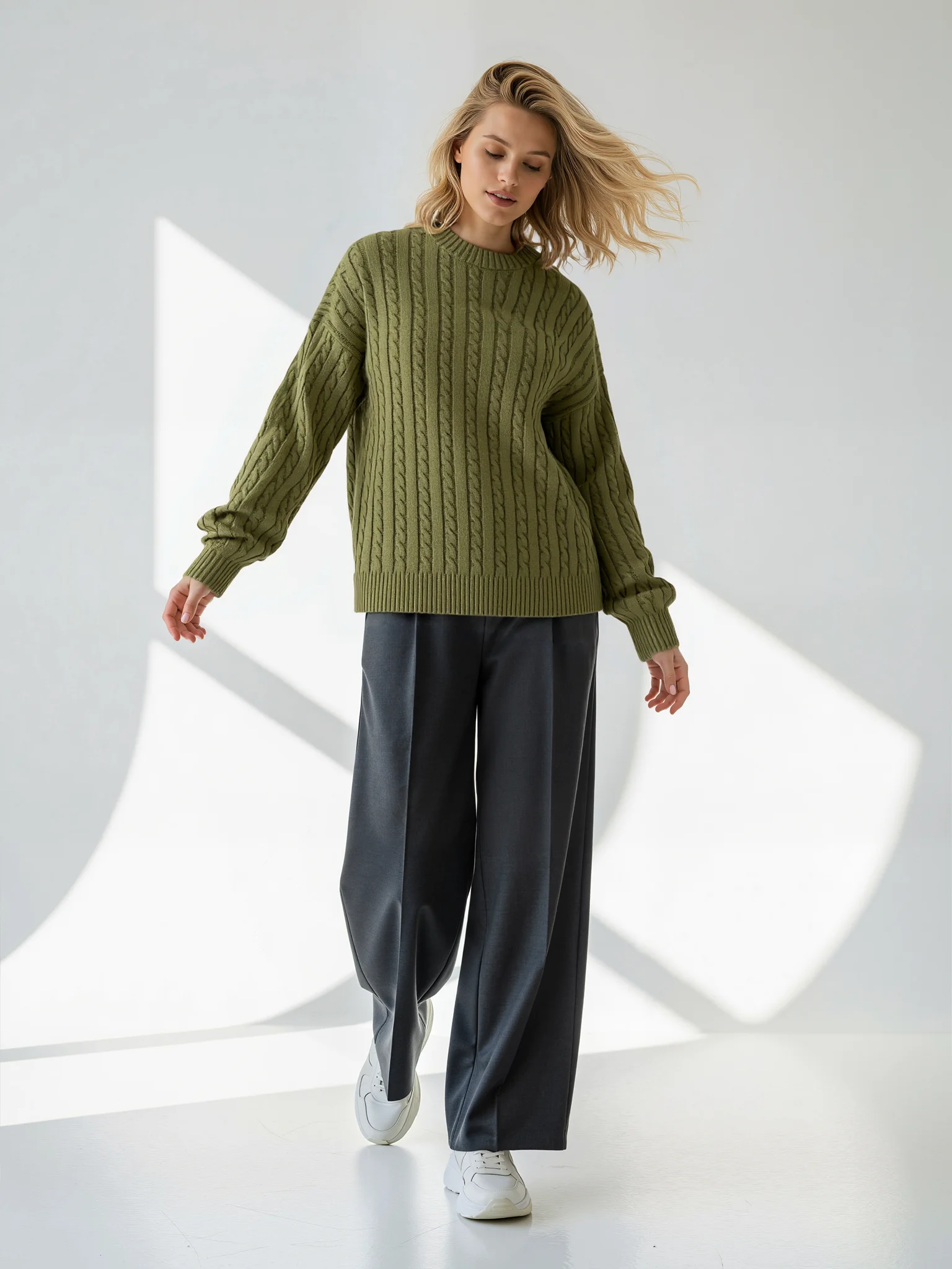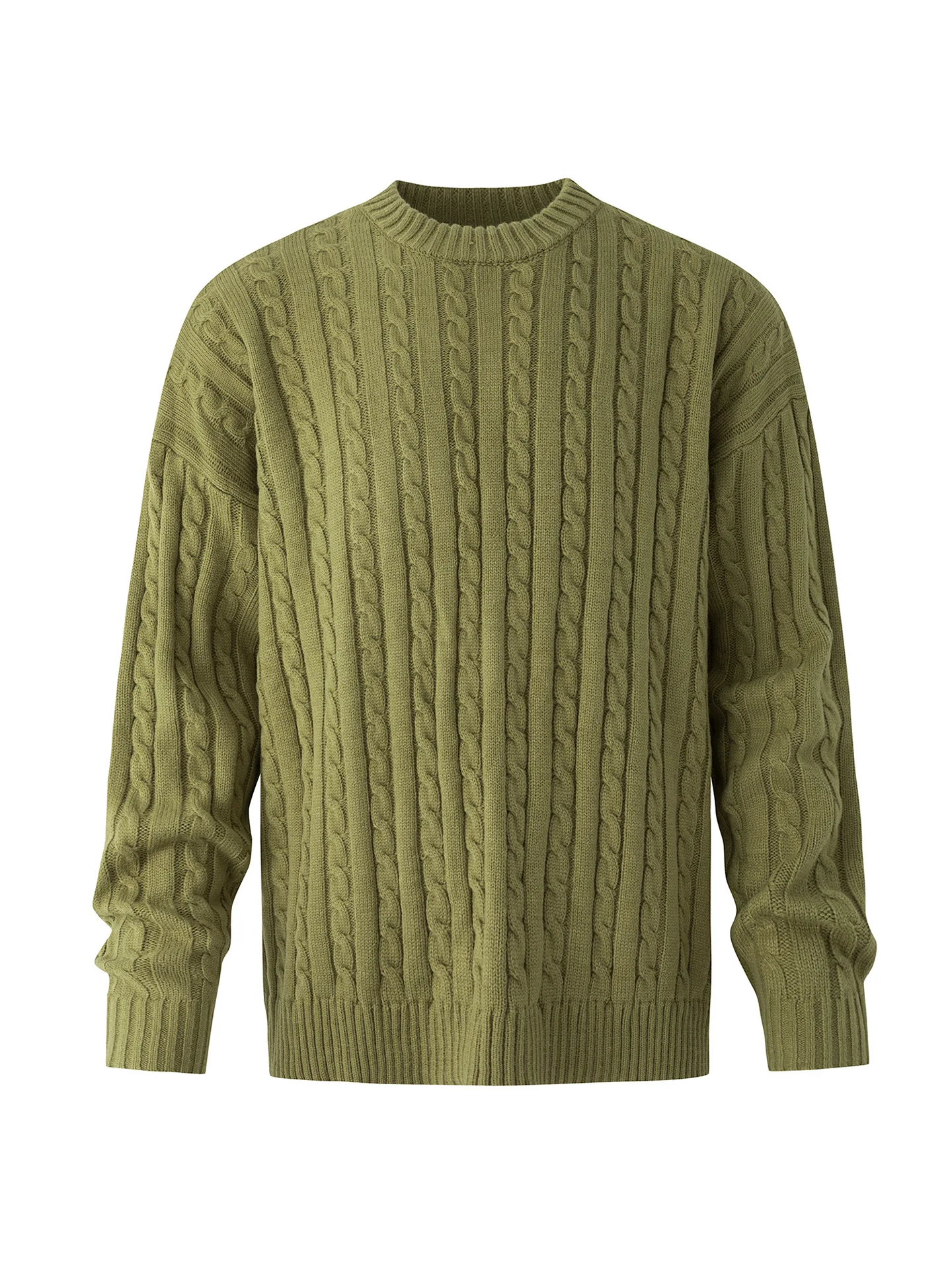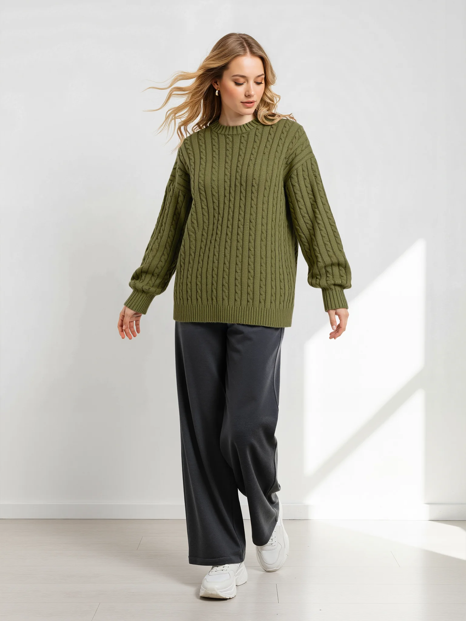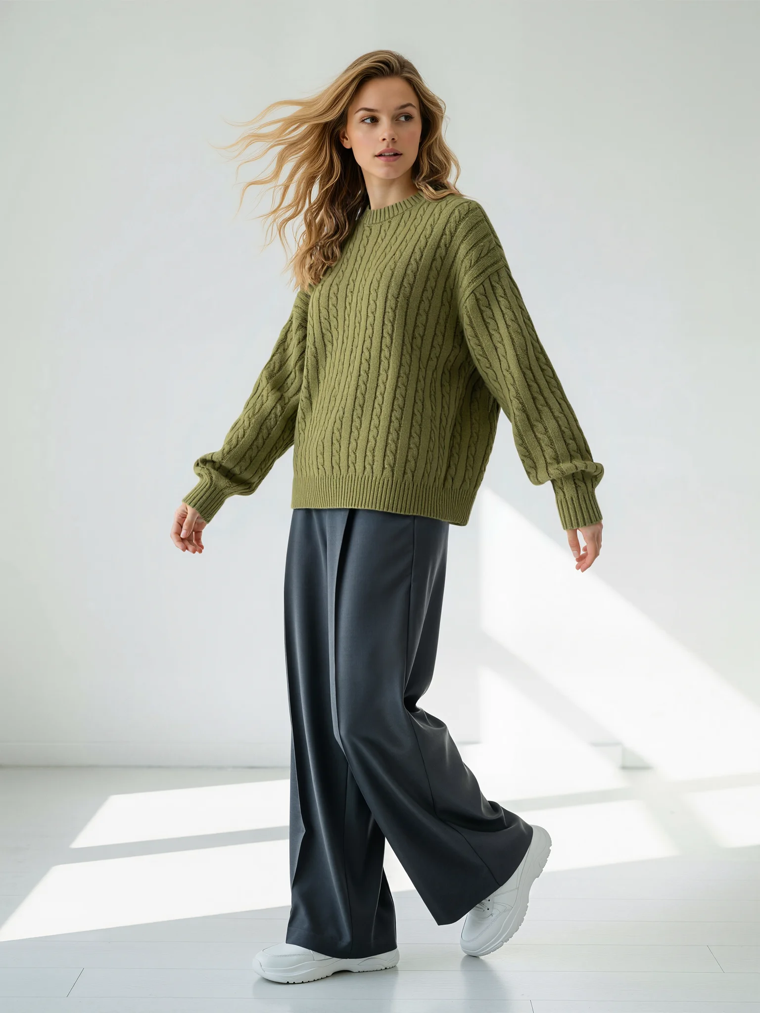 Women's Casual Wool Cashmere Pullover O-Neck Twist Jacquard Knit Sweater with Plain Color for Winter