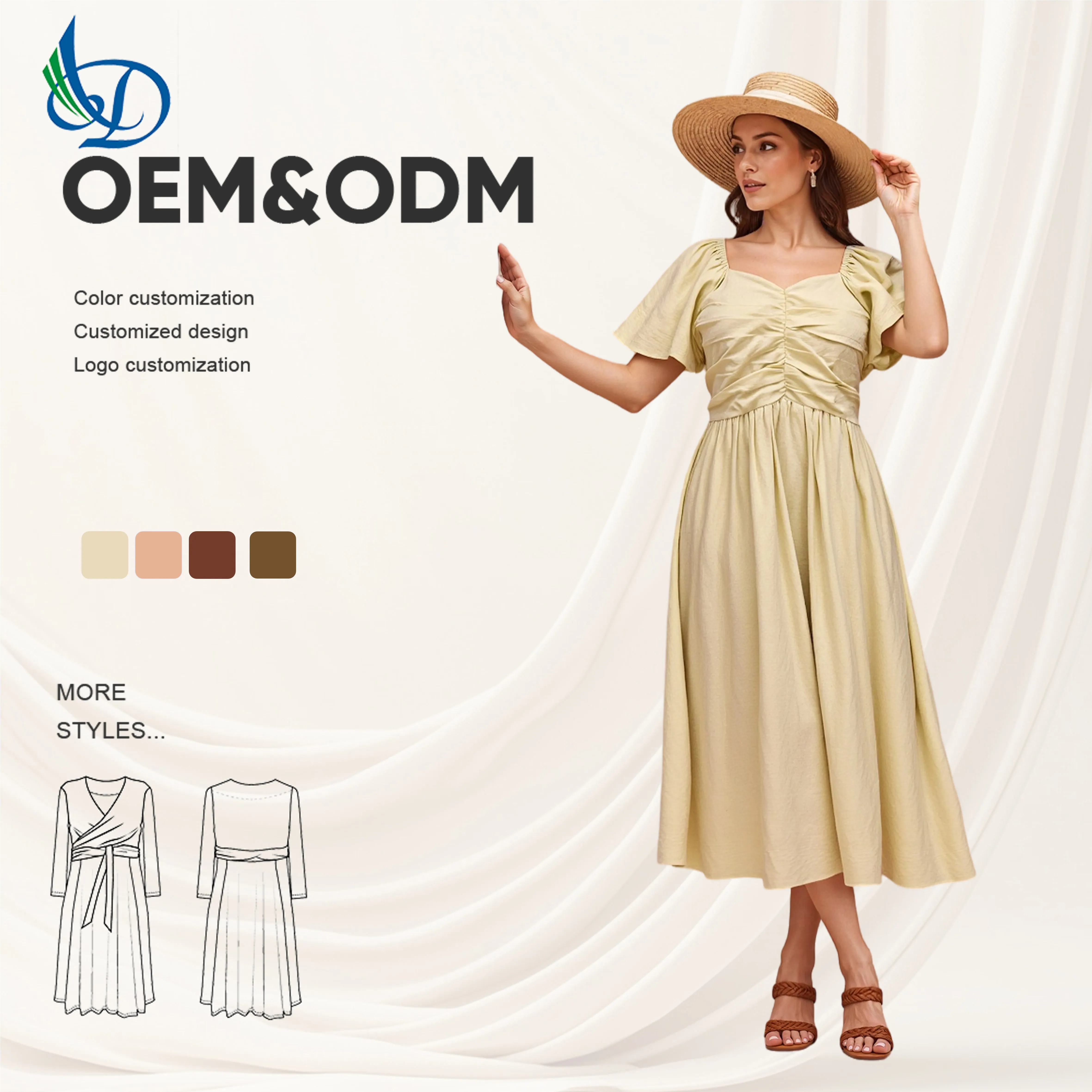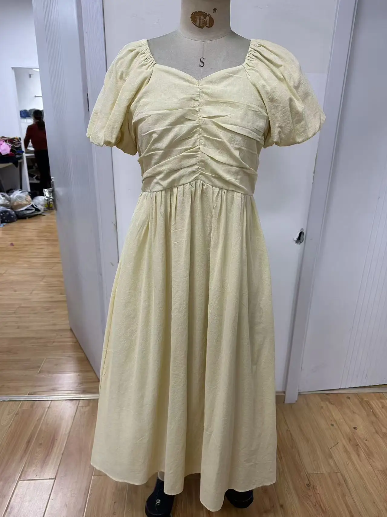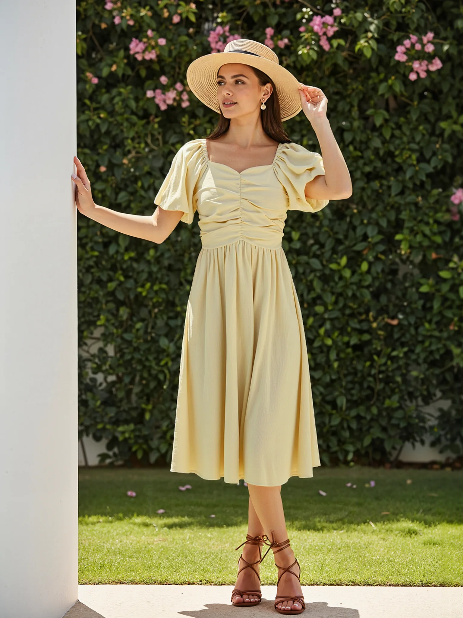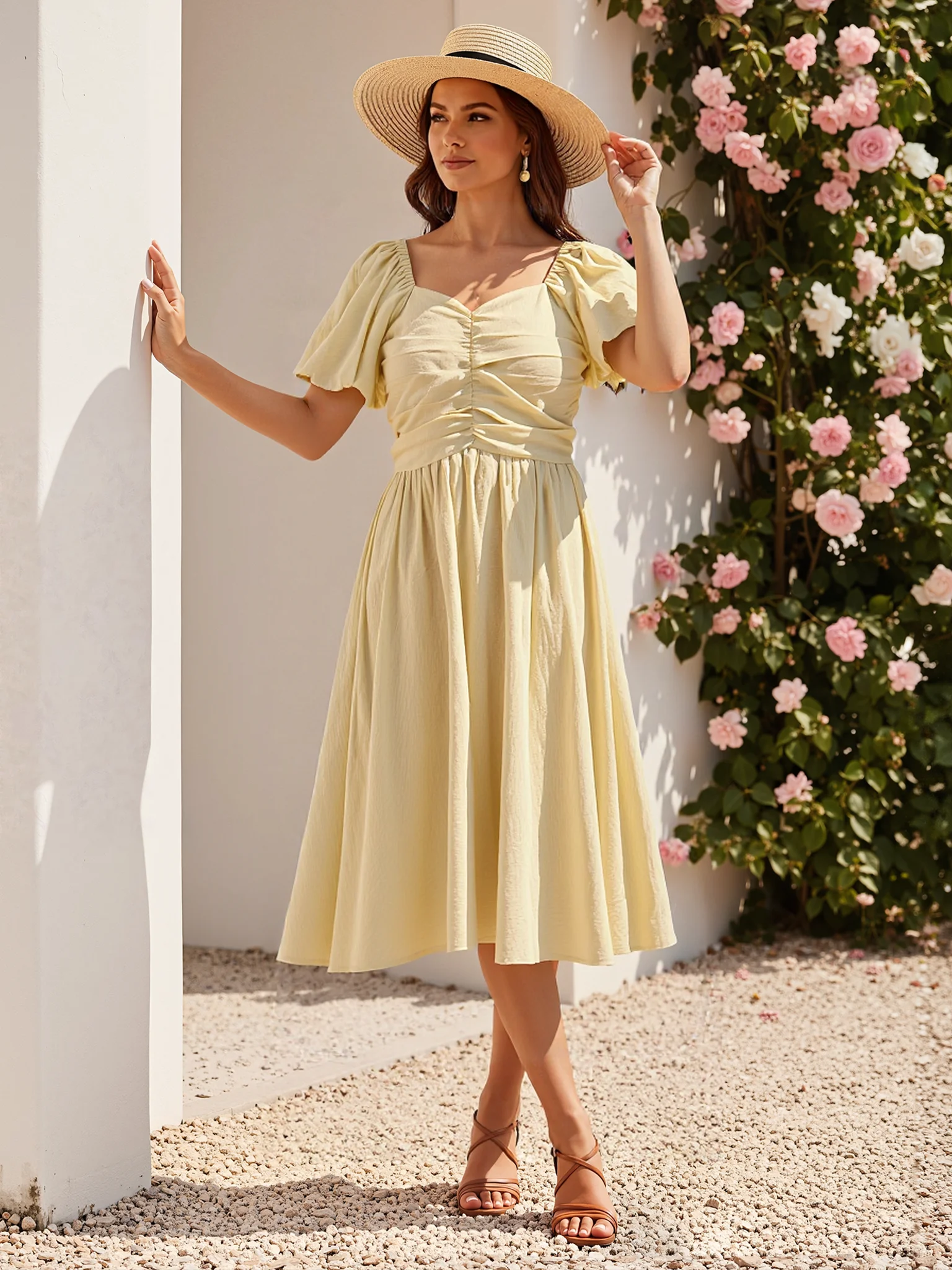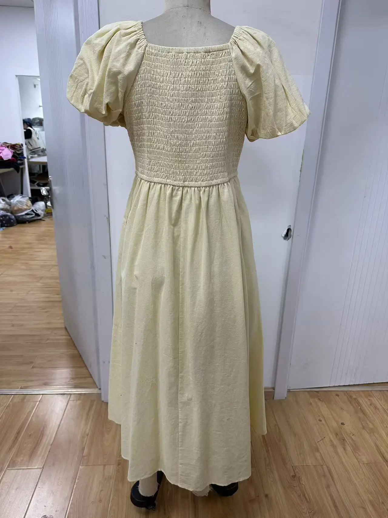 Women's Casual Dress with Bubble Sleeves, Solid Color, Natural Waist, Washable in Summer
